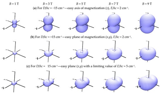 where (k, l) refer to grids distributed uniformly over a sphere. In this way, the magnetization can be visualized with a 3D diagram, as shown in Figure 2. It must be noted that when |D| < 3E, a renumbering of the Cartesian axes results in the usual constraint |D| > 3E. In a very high field (50 T), the system becomes isotropic, and its 3D magnetization refers to a sphere.