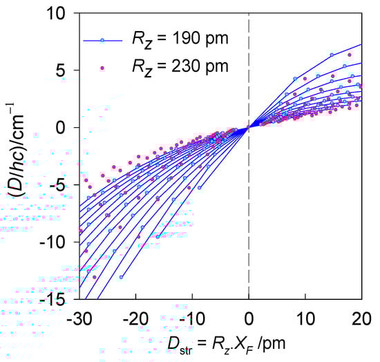 A modelling of the magnetic D-values (exact multiplet splitting) depending on the transformed structural ordinate is shown in Figure 4. The important message is that such dependence is generally non-linear; however, within the relevant experimental range, it follows a nearly linear relationship. In fact, the dependence—the correlation line of the magnetostructural D-correlation—is represented by a pair of nearly collinear straight lines intercepting at the octahedral geometry where D and Dstr are zero. The calculations using GCFT were performed for the nephelauxetic ratio β = 1, and the orbital reduction factors κz = κxy = 1; therefore, the results are tentative.