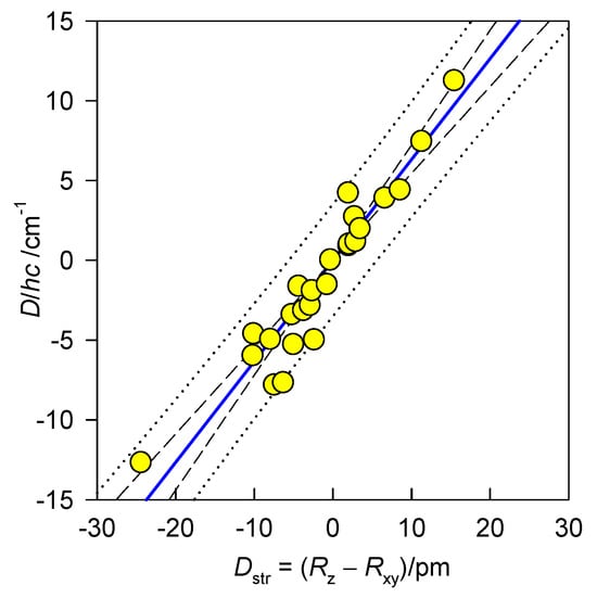 The magnetic data used hereafter were collected quite recently using the SQUID magnetometer. The magnetic susceptibility (χ) was taken at the applied field of BDC = 0.1 T between T = 1.9 and 300 K. The magnetization data (M) were taken at T = 2.0 and 4.6 K, respectively, up to B = 5 or 7 T. Both datasets were fitted simultaneously using a numerical procedure that minimizes a joint functional . A collection of 25 datapoints (objects = complexes under study) is displayed in Figure 5 along with a common linear correlation D vs. Dstr. This simple regression analysis was performed in SigmaPlot software [] and clearly confirms the linear dependence in the given interval of Dstr values. Based on the analysis of variance (ANOVA), one can conclude that the independent variable Dstr can be used to predict the dependent variable D (large F and P < 0.05). A list of the compounds and numerical data is provided in the Supplementary Information [,]. The correlation predicts that with increasing structural tetragonality Dstr (in the direction compressed tetragonal bipyramid–octahedron–elongated tetragonal bipyramid), the axial zero-field splitting parameter D increases.