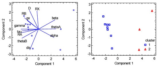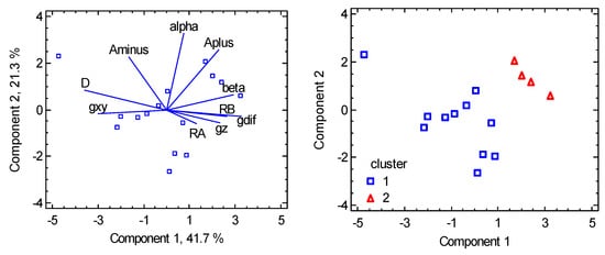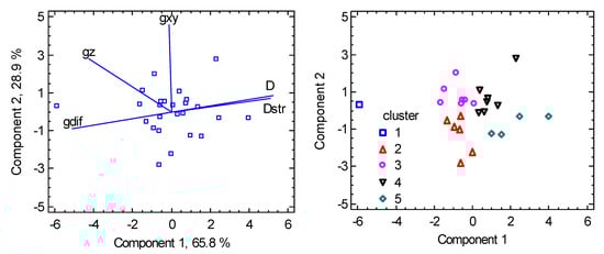 Another piece of information is obtained from the multivariate data analysis, which we performed using the Statgraphics software []. Principal Component Analysis (PCA) transforms the set of original variables into their linear combinations (principal components), bearing the maximum variability in the data. Two components bear 94.7% of the variability in the present case. The biplot in Figure 6 shows how the individual variables are interrelated: the closest rays refer to a positive correlation, and the farthest rays refer to a negative correlation (anticorrelation). The graph proves that the g-factor asymmetry (gdif = gz − gxy) anticorrelates with the D-parameter, in agreement with the spin-Hamiltonian formula . On the other hand, it confirms the strong positive correlation between D and Dstr. Classification of the individual points according to the clusters allows us to visualize the clusters’ separation.