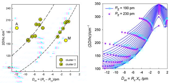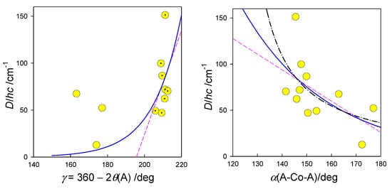 Magnetostructural D-correlation for hexacoordinate Co(II) complexes. Lines—fitted with an exponential (clu 1: b = 331.81, c = 0.08, R2 = 0.71, F = 14.57, P = 0.009; clu 2: b = 218.92, c = 0.09, R2 = 0.95, F = 82.63, P = 0.0008). A and M were omitted from the correlation (left). Calculated magnetic D-values for different equatorial–axial crystal field strengths vs. the transformed structural ordinate Dstr for hexacoordinate Co(II) complexes. Solid lines interpolate the points for the common axial metal–ligand distance Rz = 190 pm. Pink points bracket the second limiting case, Rz = 230 pm (right).