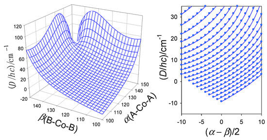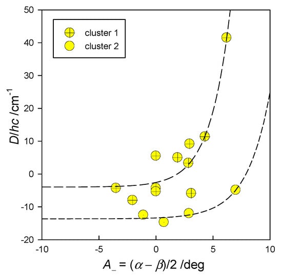 Before proceeding to the discussion of magnetostructural D-correlations, we briefly mention the original type of Correlation Analysis of structure–magnetism relations in transition metal complexes. Relationships between selected structural parameters and the magnetic properties of dinuclear (polynuclear) metal complexes were outlined by Hatfield [,], his co-workers, and followers. In [CuII-(OH)2-CuII]-type complexes, the isotropic exchange constant J correlates with the bond angle α = Cu-O-Cu along a straight line with negative slope