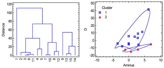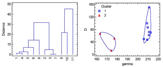 A collection of 16 datapoints is displayed in Figure 7 (left), from which it is evident that a linear correlation does not apply in this case. This is understood from the transformed 3D graph D = f(F4(xy), F4(z)) into a 2D diagram D = f(Dstr) (Figure 7, right). For the complexes with a heterogeneous coordination sphere, the mean distances 2.185, 2.085, and 2.475 Å were used to calculate the experimental Dstr values. The data worksheet is listed in the SI and processed using multivariate statistical methods [,]. The Cluster Analysis based on three variables (labelled as Dstr, D2 = 2D and gxy) shows that the distance separates the objects into two principal clusters (Figure 8). Their separation is also well-seen from the Principal Component Analysis (Figure S2). The assumption on which the correlation 2D vs. Dstr is based is thus statistically confirmed. It is clear that the discovered clustering classifies objects based on close Dstr values, with cluster 1 including complexes with significantly more negative Dstr. However, for the purposes of Correlation Analysis, we excluded outliers A and M from individual clusters. We assume that these objects may indicate new clusters in the segment Dstr < 0. If we accept this assumption, then the non-linear correlation 2D vs. Dstr has a satisfactory predictive character.