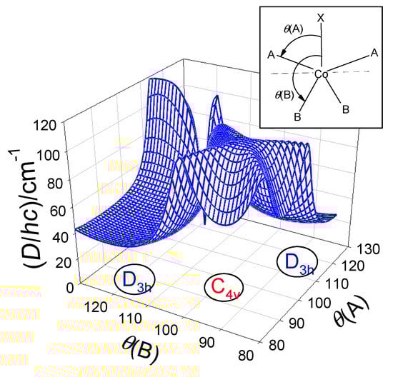 It is obvious that the correlation D vs. P (a geometrical parameter) is derived from the electronic structure of complexes. The problem of electronic structure, as well as magnetic properties, is solved mainly at the level of quantum–chemical (first-principle) calculations [,,]. The application of the partitioning technique and/or quasi-degenerate perturbation theory yields the matrix elements of the effective Hamiltonian spanned by the spin manifold of the orbitally non-degenerate ground electronic state as follows