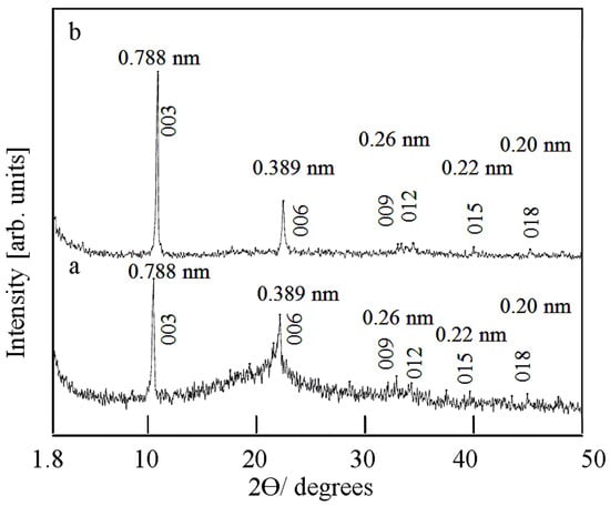This indication was confirmed by increasing the reaction time to 15 h because Figure 1b shows clear reflections of hkl planes (003), (006), and (009). X-ray diffraction of CNOVC showed a strong and sharp peak at 0.788 nm. The comparison between the reflections of the main planes (003), (006), and (009) showed that d003 (0.788 nm) ≈ 2 × d006 (0.389 nm) ≈ 3 × d009 (0.26 nm). This means that the CNOVC layers were highly packed in an ordered form along axis c. The lattice parameter “c” was estimated as 3 × d003 = 2.364 nm. Compared with the lattice parameters that were published for synthetic and natural hydrotalcites and the well-known LDH materials in the carbonate form (JCPDS file No. 37-629) and (JCPDS file No. 48-1022), this value shifted from c = 2.2575 nm to 2.364 nm [40]. This shift may be caused by the inclusion of cyanate anions between the CNOVC layers. Also, Figure 1b shows the reflections of the non-base planes (012), (015), and (018) at 0.25 nm, 0.22 nm, and 0.20 nm, respectively. The growth of the non-base and the base planes of CNOVC indicate the positive effect of raising the reaction time to produce the V/Co LDH crystals and confirm a complete formation of the layered structure of V/Co LDH.