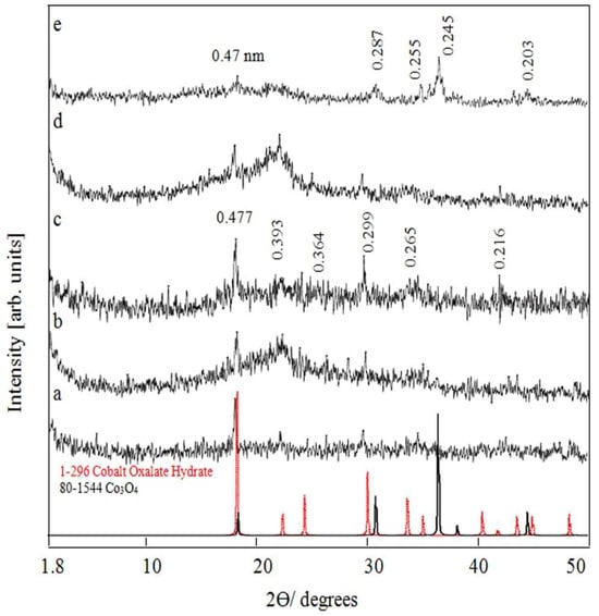 After calcination of OXVC-16 at 500 °C, new peaks were observed at 2θ = 18.7°, 31.06°, 35.11°, 36.61°, and 44.46°, agreeing with spacing of 0.47 nm, 0.287 nm, 0.255 nm, 0.245 nm, and 0.203 nm, as shown in Figure 2e. All these peaks could be identified as cobalt oxides Co3O4 through matching with the standard entire diffraction pattern (JCPDS No. 80-1544) [41]. There was a slight shift from the standard diagram of cobalt oxides because of the inclusion of vanadium inside the crystals of Co3O4. No peaks were detected for vanadium, indicating that the vanadium was homogenously dispersed inside the structure of Co3O4.