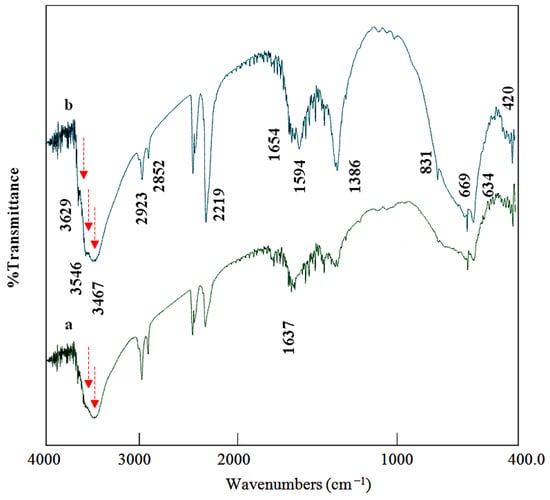 Infrared spectra of CNOVC after different reaction times: (a) 6 h and (b) 15 h (the red arrows point out different peaks for hydroxyl groups).
