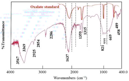 Figure 4 shows the FT-IR spectrum of the OXVC-20 sample after changing the interlayered anions. The spectrum was very similar to that generally reported for the LDH structure [42]. When compared with CNOVC, both spectra were similar except for the disappearance of the band for cyanate and the appearance of new bands for the oxalate anions. This means that OXVC-20 has an LDH structure. Figure 4 presents a series of bands at 1637 cm−1, 1359 cm−1, 1315 cm−1, 821 cm−1, and 777 cm−1. It can be seen that these bands are due to oxalate anions by comparing them with the standard pattern of oxalate. Also, the presence of oxalate in the interlayered spacing was confirmed by the appearance of hydrogen bond bands at 2925 cm−1 and 2854 cm−1, as well as the splitting of the hydroxyl band to one band at 3369 cm−1 and a shoulder at 3567 cm−1. This means that the presence of oxalate anions inside the interlayered spacing created hydrogen bonds and caused the lowering of O–H bond electron density.