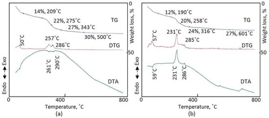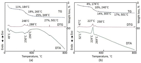 Figure 5b presents the TGA, DTG analysis, and DTA curves of CNOVC measured in the presence of laboratory air. The DTA curve revealed exothermic peaks at 231 °C and 286 °C. These peaks confirmed the oxidation reactions of cobalt and vanadium in addition to the reactions of cyanate anions with oxygen in the air. For the DTG analysis and TGA curves, similar results for that of nitrogen gas were observed, as shown in Figure 5b. It can be concluded that the structure of CNOVC consists of two anions and intercalated water.