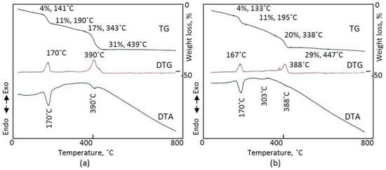 For OXVC-20, Figure 7 shows the thermal analyses of the sample after reaction times of 6 h and 15 h. The TGA curves indicate that OXVC-20 has two kinds of water and two kinds of oxalate anions, which agrees with the FT-IR data because of the appearance of four weight losses. Surface water comprised 4 wt.% and was lost at 133–141 °C. Subsequently, 11 wt.% of the interlayered water was removed at 190–195 °C. Finally, 18–20 wt.% of the oxalate anions were lost at 439–447 °C through two steps because there are two kinds of oxalate anions, which agrees with the XRD results. DTG analysis and DTA confirmed the TG results through the appearance of two peaks at 167–170 °C and 388–390 °C.