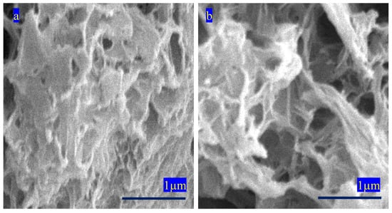 The imaging technique of scanning electron microscopy (SEM) includes a platinum coating system for the measured samples to increase the resolution of the images. Therefore, thin films of platinum were used to coat the powder samples. Figure 8 shows SEM images of CNOVC. They show that CNOVC has plate-like morphology, agreeing with the literature on LDHs [48,49,50]. Hexagonal plates were observed for the CNOVC sample, as seen in Figure 8b.
