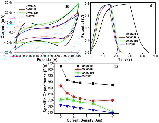 Comparison of (a) CV, (b) CD, and (c) the calculated specific capacitance of all the electrodes (OXVC-20, OXVC-16, OXVC-500, and CNOVC) at different current densities.