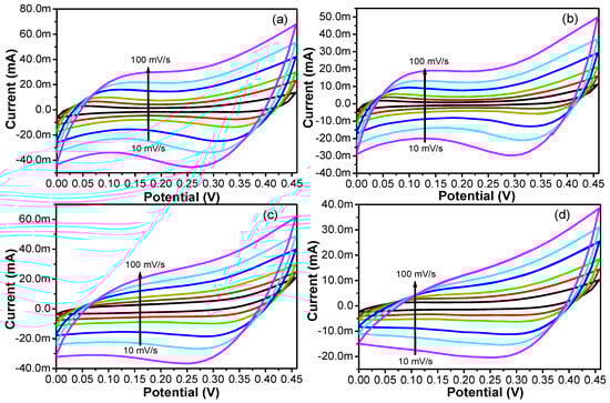 CV of the (a) OXVC-20, (b) OXVC-16, (c) OXVC-500, and (d) CNOVC electrodes at different scan rates.