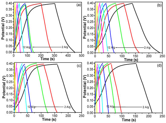 For a better understanding of the electrochemical performance and capacitive nature of the OXVC-20, OXVC-16, OXVC-500, and CNOVC electrodes, the GCD profiles of the electrodes were measured at fixed current and different current loads. The results are presented in Figure 10, Figure 11 and Figure 12. Figure 10 shows the comparative GCD curves of the OXVC-20, OXVC-16, OXVC-500, and CNOVC electrodes displaying the rapid and fast response, which further confirmed the Faradic behavior of the electrodes. The specific capacitance of each electrode was calculated using the discharge time.