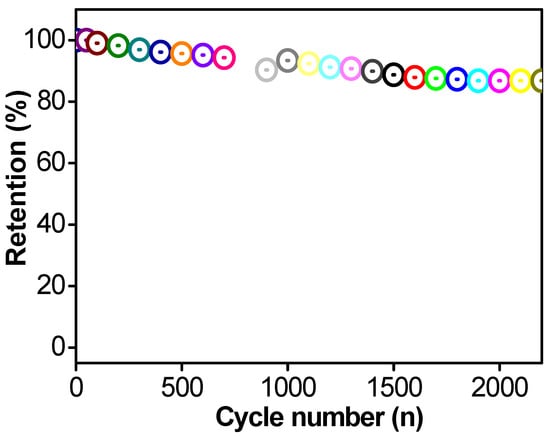 Percent retention performance of the OXVC-20 electrode (different color means new cycle).