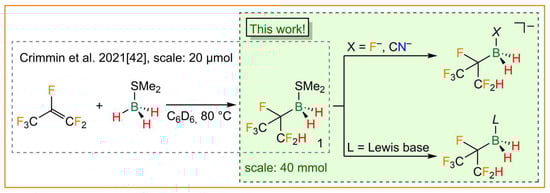 A different approach was described for the synthesis of novel partially fluorinated alkylhydridoborane adducts in 2019. These adducts were obtained as unexpected products in an attempt to hydrodefluorinate hexafluoropropene with the hydridoborane adducts BH3·THF and BH3·SMe2 (Figure 1) [42]. The hexafluoroisopropyldihydridoborane adducts, which are easily accessible using the aforementioned route, are the first selectively accessible boranes described that bear polyfluoroalkyl substituents that contain a single hydrogen atom. Furthermore, the polyfluoroalkyl group is branched, which is rarely found in per- and polyfluoroalkylboron chemistry [18].