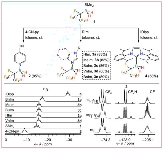 The 4-cyanopyridine (4-CN-py) adduct 2 was synthesized from 1 and 4-CN-py in a yield of 85%. Borane adducts of pyridine and 4-cyanopyridine are valuable starting compounds for imidazole and related N-heterocyclic derivatives with boranes attached to one or two nitrogen atoms of the central N-heterocyclic ring. Adducts of this type with the borane Lewis acids B(CN)3 [43] and C2F5BF2 have been deprotonated to obtain mono- and dianionic N-heterocyclic carbenes (NHCs) as well as anionic cyclic (alkyl)(amino)carbenes (Ani-cAACs) [44,45,46]. However, it was found to be even more convenient to react 1 directly with imidazole derivatives to furnish the corresponding imidazole adducts. Complexes of hexafluoroisopropylborane 1 with imidazole (HIm, 3a), 1-methylimidazole (MeIm, 3b), 1-butylimidazole (BuIm, 3c), 1-vinylimidazole (VnIm, 3d), and benzimidazole (BnIm, 3e) were isolated in high yields of 82–89%. Furthermore, stabilization of hexafluoroisopropylborane was achieved by attachment of 1 to the carbene C atom of a N-heterocyclic carbene, i.e., by the reaction of 1 with 1,3-bis(2,6-diisopropylphenyl)-imidazolin-2-ylidene (IDipp, 4). Since 1 was obtained as a racemate via the hydroboration reaction, 2, 3a–e, and 4 were also obtained as racemates. The borane adducts 2, 3a–e, and 4 were found to be stable against hydrolysis, which underlines the stabilizing effect of the electron-withdrawing (CF3)(CF2H)CF group. Hence, borane adducts of 1 are more stable than, for example, related adducts of fluorodicyanoborane, e.g., BF(CN)2·4-CN-py undergoes rapid hydrolysis [43]. All hexafluoroisopropylborane adducts were characterized by elemental analysis and NMR and vibrational spectroscopy (Table 1, Figure 2). The 11B NMR signals are in the region typical for tetravalent boron and their shift depends on the Lewis base coordinated to boron. The signals are split into triplets, due to 1J(11B,1H) couplings of 88.1–100.2 Hz. The 19F NMR signals reveal complex coupling patterns as a result of mJ(19F,19F) (m = 3,4), nJ(19F,1H) (n = 2–4), and 2J(19F,11B) couplings (Figure 2). The IR and Raman spectra of the adducts 2, 3a–e, and 4 display characteristic B−H stretching bands in the region of 2403–2471 cm−1 (Table 1). Furthermore, the thermal properties of the hexafluoroisopropylborane adducts were investigated by differential scanning calorimetry (DSC). 2, 3b, and 4 are solids at room temperature, whereas 3a, 3c, 3d, and 3e are liquids with glass transitions in the range of −87 to −37 °C. All adducts are very thermally robust with decomposition temperatures in the range of 182–256 °C.
