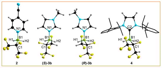 Single crystals of 2, 3b, and 4 were studied by SC-XRD (single-crystal X-ray diffraction). Whereas 2 and 4 crystallized as racemate in the centrosymmetric space group P, single crystals of the two enantiomers (S)-3b and (R)-3b were obtained and the structures were refined in the chiral space group P1 (Figure 3). The lengths of the dative B−N bonds in 2 and 3b (Table 2) are in the range of isoelectronic C−C single bonds and of the B−N bonds in the adducts of the Lewis superacid B(CN)3 with 4-CN-py (1.592(2) pm) [43] and MeIm (1.558(4) pm) [45]. The B−CNHC bond length of 4 is slightly longer than that of BH3·IDipp (1.585(4) pm) [47], which probably reflects the greater steric demand of the hexafluoroisopropylborane compared with BH3 (vide infra).