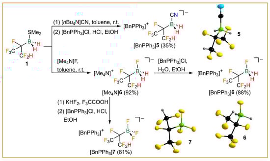- Hennig, P.T.; Sprenger, J.A.P.; Schneider, L.N.; Ignat’ev, N.V.; Finze, M. The pentafluoroethyltrihydridoborate anion: From shock sensitive salts to stable room temperature ionic liquids. Chem. Commun. 2019, 55, 6110–6113. [Google Scholar] [CrossRef] [PubMed]