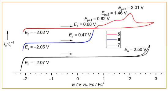 To test their use as conducting salts or electrolyte additives and to verify the electrochemical stabilities of the new borate anions 5, 6, and 7, cyclic voltammetry was performed on 0.05 M solutions in acetonitrile (Figure 6). Since the cathodic limit is predominantly defined by the reduction of the [BnPPh3]+ cation, almost identical limits were observed for all three borates. However, for the anodic limit, which is mainly determined by the electrochemical stability of the borate anion against oxidation, significant differences were found. The fluorodihydridoborate anion [(CF3)(CF2H)CFBH2F]− (6) is the least stable (Ea = 0.47 V) in the series, whereas the trifluoroborate anion [(CF3)(CF2H)CFBF3]− (7) is the most electrochemically robust anion, with Ea = 2.50 V. This value is similar to the anodic limits that have been reported for neat room temperature ionic liquids (RTILs) with related perfluoroalkylborate anions, e.g., Ea = 2.1 V for [EMIm][CF3BF3] and [EMIm][C2F5BF3] (EMIm = 1-ethyl-3-methylimidazolium) [30]. The cyanodihydridoborate anion [(CF3)(CF2H)CFBH2(CN)]− (5) exhibits a slightly higher stability than anion 6 (Ea = 0.68 V). It undergoes a complex irreversible multistep oxidation (Figure 6). Similar or even slightly higher oxidative stabilities are often observed for cyanoborate anions compared with analogous fluoroborate anions [30,31,54]. For example, the neat RTIL [BMPL][BF(CN)3] ([BMPL]MFB; BMPL = 1-butyl-1-methylpyrrolidinium) is more stable (Ea = 2.6 V) than the related RTIL [BMPL][BF2(CN)2] ([BMPL]DFB; Ea = 2.0 V) [54].