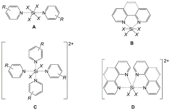 In the exploration of the chemistry of hypercoordinate silicon compounds [,,,,,], i.e., compounds with penta-, hexa- or even higher coordinated silicon atoms, a Lewis acid-base adduct of a silicon halide and simple N-donor ligand played a pioneering role. The complex SiF4(NH3)2 has been reported in the literature more than two centuries ago []. Its crystallographic analysis confirmed the trans-arrangement of the two monodentate N-donor ligands (i.e., ammonia molecules) in the octahedral Si coordination sphere []. The binding of chelating bidentate diamines (such as N,N,N′,N′-tetramethylethylenediamine, TMEDA) to silicon halides may yield hexacoordinate Si complexes with cis-arrangement of the N-donor ligands (e.g., in SiF4(TMEDA) [] and SiCl4(TMEDA) []). Related silicon coordination chemistry with pyridine derivatives gave rise to a variety of related Lewis acid-base adducts, i.e., for silanes with monodentate Si-bound substituents X the coordination of two molecules of monodentate pyridines at various silanes afforded hexacoordinate Si complexes with trans-arrangement of the N-donors (type A in Figure 1, e.g., with R,X4 = H,F4 [], 4-Ph,F4 [], H,Cl4 [], 4-Me,ClnBr4−n [], 3,5-Me2,Br4 [], H,Cl3(OSiCl3) [], 4-Et,H2Cl2 [], 3-Me,H2Cl2 [], 4-Me,HMeCl2 []). Chelating bidentate pyridine derivatives, such as 2,2′-bipyridyl (bipy) or phenanthroline (phen), afforded complexes with cis-arranged N-donors (type B, e.g., SiF4(bipy) [], SiF3(CCPh)(bipy) [], Si(C2F5)2(OPh)2(phen) [], SiCl2H2(bipy) [], Si(NCS)4(bipy) [], and Si(NCO)4(phen) []). In some cases, excess N-donor ligands may bind to the Si atom with ionic dissociation of two Si-bound substituents and with retention of the Si coordination number 6. For monodentate pyridine ligands, the formation of ionic complexes of the type C was observed, in which the remaining monodentate substituents X are trans (e.g., with R,X2 = 3-Me,H2 [], 4-Me,Cl2 []). For related complexes with chelating bidentate N-donor ligands, the formation of complexes of type D was observed (e.g., [SiCl2(bipy)2]2+ [], [Si(OH)2(bipy)2]2+ [], [Si(OMe)2(phen)2]2+ []).