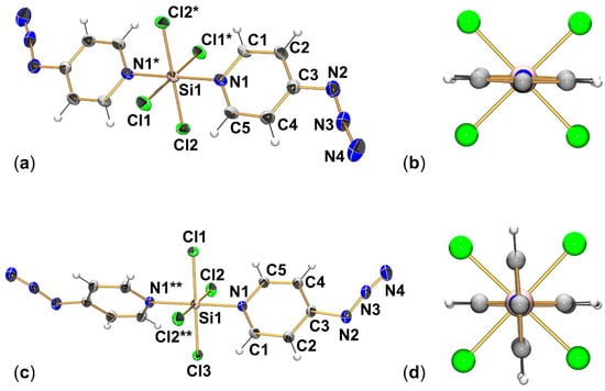 The reaction of 4-azidopyridine (1) and SiCl4 (in approximately 2:1 molar ratio) in chloroform at room temperature with stirring proceeded with the formation of a clear solution, from which a solid crystallized in the course of the following hours. This solid dissolved upon heating, and upon cooling, the product crystallized again. As both compound 1 and SiCl4 are liquids at room temperature, the solid state of the new product indicated the formation of an adduct (such as SiCl4(4-azidopyridine)2), and elemental analyses (C,H,N) were in accordance with this composition. Solution state NMR spectroscopy (of a sample dissolved in CDCl3), however, pointed at the co-existence of the starting materials. The 1H and 13C{1H} spectra essentially represented those of 1, and the 29Si{1H} NMR spectrum exclusively exhibited a signal at ca. −19 ppm, characteristic of SiCl4 with its tetracoordinate Si atom (cf. Appendix A incl. Scheme A1 and Figure A1). Thus, dissolution and crystallization of this product proceed with dissociation and formation of the adduct SiCl4(4-azidopyridine)2. In the course of exploring different crystallization conditions for improved yield, we noticed that both storage of the product solution at room temperature and in a fridge (ca. 6 °C) afforded a coarse-crystalline product (block-like crystals), whereas instant transfer of the solution into a freezer (ca. −39 °C) gave rise to the formation of a fine-crystalline product with needle-shaped crystals. In both cases, crystals suitable for single-crystal X-ray diffraction analysis were found in the batches, and their analyses proved the formation of two different modifications of the product SiCl4(4-azidopyridine)2 (2) (Figure 2 and Figure 3, Table 1 and Table A1). Also, the crystallographic analyses confirmed the formation of the predicted Lewis acid-base adduct with a hexacoordinate Si atom. As the two crystalline modifications accommodate two different conformers of this compound, both the modifications and their respective conformers will be denoted as 2′ (for the variety obtained at a higher temperature) and 2″ (for the variety obtained at a lower temperature) in the following.