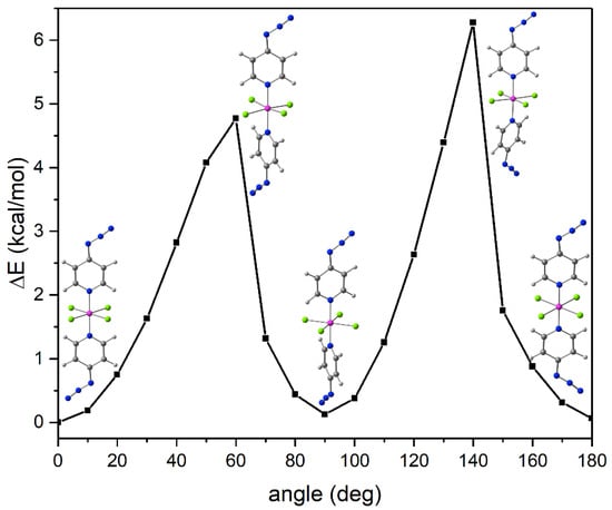 For the isolated molecule of compound 2, a Potential Energy Surface Scan (PES) was performed for the rotation of one pyridine ring about the N-Si-N axis (variation in the C-N-N-C dihedral angle in increments of 10° followed by partial relaxation of the remaining parameters, starting from the fully optimized molecular structure of 2′). Close to local minima, full optimization was allowed for analysis of the local energetic minimum. The diagram in Figure 5 shows the energetic development of the conformational variation for a 180° rotation. In addition to the conformations at 0° and 180° (which are basically distinguished by their relative orientations of the remote azido groups), the conformation at a dihedral angle of 90° (staggered conformation corresponding to 2″) exhibits an energetic minimum of essentially the same depth (the energetic difference of 0.13 kcal mol−1 can be interpreted as meaningless). This is in accordance with an older study of D2h and D2d symmetric conformers of trans-SiCl4(pyridine)2. These conformers were shown to exhibit essentially the same thermodynamic characteristics (enthalpy and entropy of dissociation into SiCl4 and pyridine) []. Thus, the packing efficiency might be the predominant parameter. Analysis of the Hirshfeld surface (HS) of 2′ indicates a greater number and higher intensity of close intermolecular contacts with respect to the HS of 2″ (Appendix C, Figure A2, Figure A3 and Figure A4). For an energetic analysis of the difference in packing, DFT methods were applied. The molecules of 2′ and 2″ were optimized in their periodic crystal environment (with full optimization of the molecular conformation and optimization of the unit cell parameters allowed, as the analysis aimed at an energetic comparison at 293 K rather than a comparison at the temperature of crystal structure determination (which was 200 K). The analysis revealed 2′ in its crystal environment to be more stable than 2″ in its packing by 8.5 kcal mol−1 with respect to 1 mol of each kind of molecule in its respective crystal environment. In regard to the experimental data, this computational finding is in accordance with the different molecular volumes occupied in their crystal packings: Whereas in 2″ one molecule of the complex requires a volume of 416 Å3, the volume per molecule of 393 Å3 indicates a much more efficient packing for 2′.