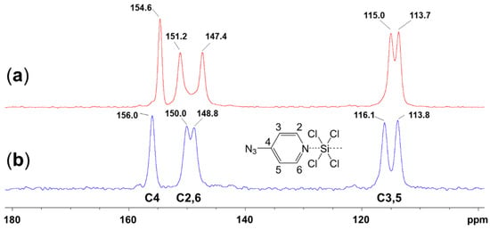 The 1H, 13C{1H} and 29Si{1H} NMR spectroscopic confirmation of the presence of 4-azidopyridine and SiCl4 in the CDCl3 solution of 2 (especially the 29Si NMR signal at −19 ppm, which is characteristic for the tetracoordinate Si atom of SiCl4), and the crystallization of compound 2 from this solution, imply the existence of a coordination–dissociation equilibrium in this solution, which is markedly on the side of the components 4-azidopyridine and SiCl4 (Scheme A1). We probed if this equilibrium could be shifted noticeably toward the side of 2 in solution by the addition of an additional drop of 4-azidopyridine to the NMR sample. In a rapid exchange equilibrium (on the NMR time scale), shifting of the equilibrium toward the species with hexacoordinate Si atom should result in an upfield shift of the average 29Si NMR signal. However, the 29Si NMR signal remains at essentially the same chemical shift. The addition of a greater excess of 4-azidopyridine was not helpful as it induced precipitation of compound 2 from the sample. The 13C{1H} NMR spectra are more indicative of an effect of the presence of SiCl4 in the solution of 4-azidopyridine: Figure A1 shows the 13C{1H} NMR spectra of 4-azidopyridine (a) and complex 2′ (b) in CDCl3 solution, and an upfield shift of the 13C signal of the pyridine 2,6-positions as well as a downfield shift of the signal of the pyridine 4-position is observed for the solution of 2′. The relative directions of chemical shift change in these two signals are in accordance with the final positions of these signals for silicon complex 2 (as determined for 2′ and 2″ in the solid state, in which the signal of the pyridine 4-position is eventually more downfield shifted than the signals of the C atoms in 2,6-positions, cf. Figure 6).
