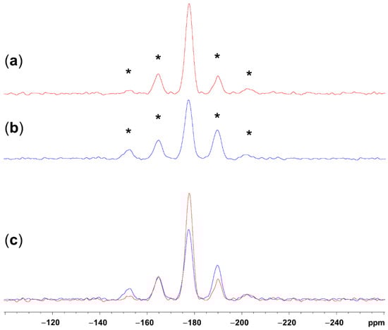 29Si CP/MAS NMR spectra of (a) 2″, (b) 2′, and (c) an overlay of both spectra, recorded at an MAS frequency of 1 kHz. The spinning side bands are marked with an asterisk (*). In the overlay (c), the intensities of the two spectra were adjusted to the side band at −165 ppm, which has a similar relative intensity in both spectra (in both cases, its integral represents ca. 15% of the sum of integrals of the isotropic signal and the two adjacent side bands).