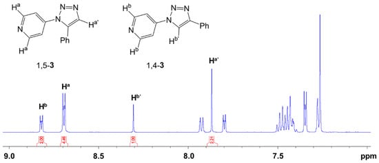 1H NMR signals of the mixture of 1,4-3 and 1,5-3 obtained by reaction of 4-azidopyridine and phenylacetylene in p-xylene at 140 °C for 0.5 h (with signals used for determination of isomer ratio and a sketch with a signal assignment to the protons of origin).