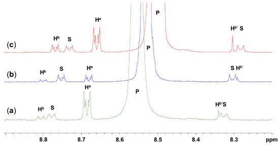 Selected section of the 1H NMR spectra used for determination of the data shown in Table 4. Subfigures (a), (b), and (c) correspond to entries 1, 2, and 3, respectively, in Table 4. The signal assignments Ha and Hb (as well as Hb′) are the same as in Figure 8. The additional signals, denoted with P and S, are the parent signals of the 2,6 protons of remaining starting material 4-azidopyridine and their 1J(13C1H) satellites, respectively. Because of the severe superposition of signal Hb’ with satellites, signals Ha and Hb were used for the determination of the isomer ratio. The slightly different individual chemical shifts are attributed to their dependence on the concentration of the various species in the solution (e.g., solvent, 4-azidopyridine, phenylacetylene) and on the presence vs. absence of SiCl4 in these solutions.