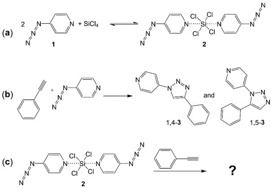 (a) Formation of adduct 2 from 4-azidopyridine (1) and SiCl4. (b) (3+2)-cycloaddition of phenylacetylene and 4-azidopyridine. (c) Reaction of compound 2 and phenylacetylene.