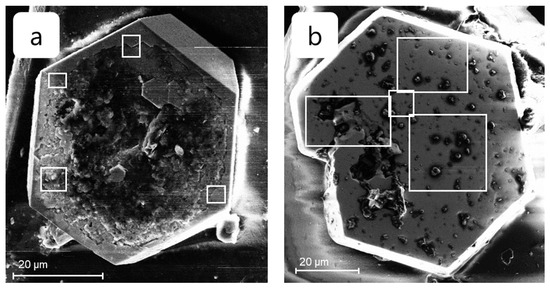 The elemental compositions were analyzed by energy-dispersive X-ray spectroscopy (EDX) measurements of the isolated single crystals using a scanning electron microscope (SEM). The SEM images of both crystals are shown in Figure 3. The averaged elemental composition of the V1.13Se0.72Te1.28 specimen analyzed from four single-crystal locations (white rectangles) was 30.7(4) at% vanadium, 27.0(4)% selenium, and 42.3(3)% tellurium. The vanadium content, according to the EDX data, was lower compared to findings from the single-crystal XRD analysis. Seemingly, this is due to the partial overlap of the vanadium Lα1, and Lβ1 signals with the oxygen Kα1 peak, which was found to be a surface artefact [21]. The Se/Te ratio determined from the single-crystal XRD measurement was 0.56, which is close to the EDX value of 0.64. The EDX analysis thus confirmed the composition of the newly synthesized phase, at least semi-quantitatively.