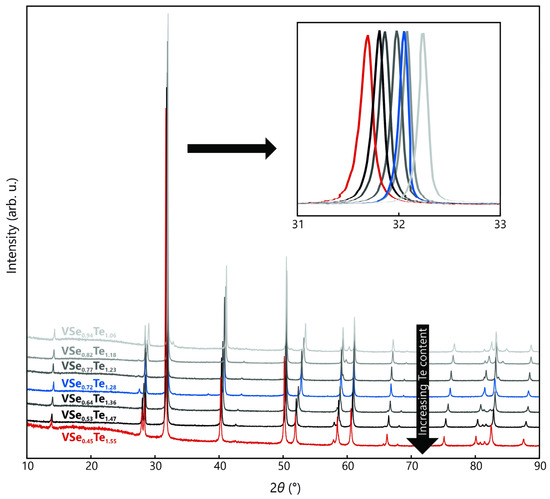 The new ternary compounds exhibited similar structures to the already known V1.04Se2 phase and a high-temperature modification of VTe2 [8,9]. The selenium and tellurium atoms occupy the Wyckoff site 2d, and the lattice parameters were found to lie between those of the structures of the binaries. The powder diffractograms of seven compounds with different stoichiometries within the VwSeyTe2−y system show the expected trend, namely that is, a larger tellurium content leads to a shift in the reflection positions to lower 2θ values.
