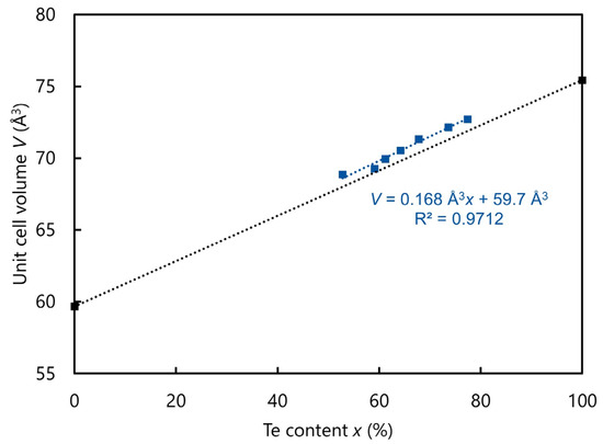 To describe the lattice parameters and the resulting unit-cell volume of similar mixed-ion compounds of the same space group, Vegard’s law can be employed [24,25], relating the lattice parameters of mixed crystals to the lattice parameters of the corresponding pure solids weighted by the molar fraction of the respective constituent. For the ternary vanadium chalcogenides, Vegard’s law is applicable when comparing VSe2 with 1T-VTe2 [7,9]. Figure 6 shows the correlation between the unit cell volume and the tellurium content of the powder samples.