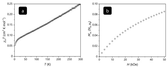 A Quantum Design DynaCool physical property measurement system (PPMS) (Quantum Design International, Inc., San Diego, CA, USA) was used for vibrating sample magnetometry (VSM) option. A polycrystalline sample of VSe0.77Te1.23 was immobilized using a polypropylene sample capsule and a brass holder. The data were measured as a function of temperature (2–300 K at 0.1 T) and magnetic field (0.1–5 T at 2 K), then corrected for the diamagnetic contributions of the sample holder and the compound (χm,dia = −1.37 × 10−4 cm3 mol−1).