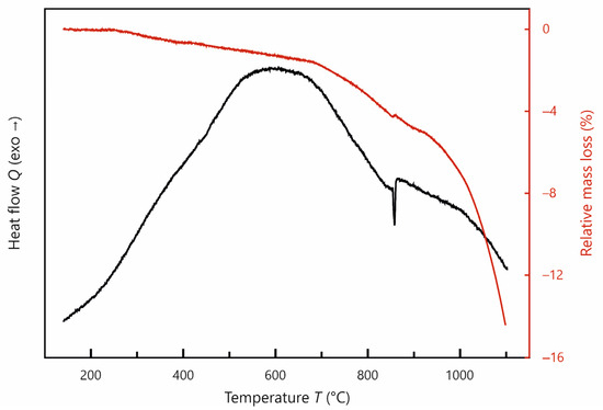 The investigation at elevated temperatures was performed using simultaneous thermal analysis (STA), which combines thermogravimetric analysis (TGA) and differential scanning calorimetry (DSC). The experiments were conducted using STA PT1600 from LINSEIS Messgeräte GmbH (Selb, Germany). Measurements were performed in a nitrogen 5.0 atmosphere, and the samples were placed into Al2O3 crucibles covered with a perforated lid. The applied temperature program involved heating to 1100 °C at a rate of 10 °C h−1 and holding this temperature for 20 min.