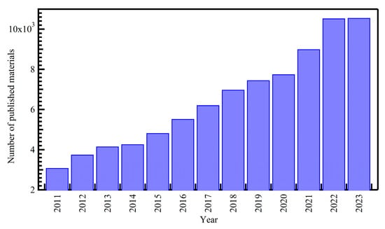 According to publication records during the last decade, there were about 77,214 publications on photocatalysis. The research output on photocatalysis has continued growing with time, with 4155 and 10,550 publications in 2013 and 2023, respectively, as shown in Figure 1. Among the metal oxides, most publications investigated TiO2, ZnO, CuO, NiO, and WO3 materials.