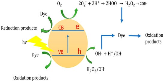 The following steps are stated as the mechanism of dye and other organic compound degradation via photocatalysis: When the catalyst is exposed to UV light, electrons move from the valence band (VB) to the conduction band (CB), resulting in the formation of an electron–hole pair (Equation (2)) [43,44].