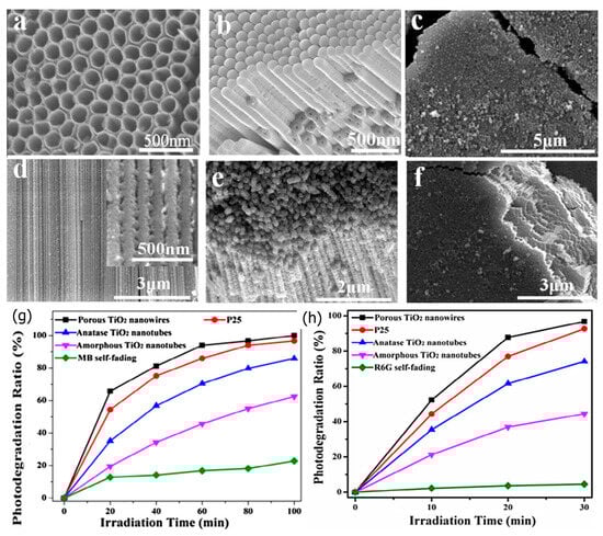 In the last decade, Zhen et al. [83], simply treated amorphous anodic TiO2 nanotubes (TiO2 NTs) in situ hydrothermally at 70 °C to prepare anatase porous TiO2 nanowires (TiO2 NWs) (Figure 3a–f). The estimated BET surface area of the prepared TiO2 NWs was 267.56 m2 g−1, nearly four times that of the utilized amorphous anodic TiO2 NTs. The photocatalytic capability of porous TiO2 NWs towards MB and Rhodamine 6G (Rh6G) were studied. Compared to TiO2 NTs or Degussa P25, the porous TiO2 NWs had superior photocatalytic activity (Figure 3g,h). The porous design and the substantial specific surface area are responsible for the increased photocatalytic activity.