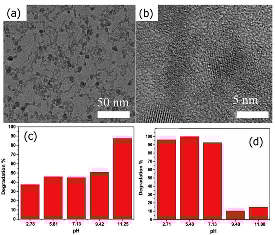 By carefully hydrolyzing titanium tetrachloride (TiCl4) with a homemade glass apparatus, Zidki et al. [86] prepared TiO2 nanoparticles. The photoactive anatase and brookite phases make up the TiO2 nanoparticles, as indicated by XRD and TEM/HRTEM image studies (Figure 6a,b). The photodegradation of MB and CR under UV–Vis light was used to illustrate the photocatalytic activity of TiO2 nanoparticles. The degradation of MB showed that, in contrast to the CR degradation, the photocatalytic degradation of MB on TiO2 nanoparticles is more effective in an alkaline environment (Figure 6c,d).