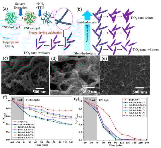 (a) Synthesis process of alcogel—TiO2, (b) the shape evolution of alcogel—TiO2 with an increasing ammonia amount. FESEM images of (c) hydrogel—TiO2, (d) aerogel—TiO2, (e) alcogel—TiO2. Concentration changes in MB aqueous solution under (f) UV—and (g) visible light. Adopted with permission from Ref. [87] Copyright 2020, Elsevier.