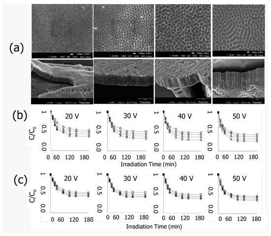 In the presence of nanotubes grown on titanium wires, photocatalytic degradation rises from 20% to about 40%. Additionally, MO degradation in the presence of Pt-loaded TiO2 nanotubes over foils matches the degradation in the presence of TiO2 nanotubes on wires. This increased photoactivity is attributed to nanotubes formed in a radially outward orientation along a titanium backbone, which effectively absorb light that is reflected and refracted. Further enhancement was achieved by Rojviroon et al. [78]. In this study, electrochemical anodization was used to create TiO2 nanotubes using thin titanium sheets at voltages of 20, 30, 40, and 50 V. The obtained TiO2 nanotubes are shown in Figure 8a. The characterization investigation revealed that the inner diameter and depth of TiO2 NTs rose with increasing anodization voltages, but their wall thickness dropped. It seems that the TiO2 NTs anodized at 50 V have shown promising photocatalytic activities towards the decolorization of indigo carmine (IC) and reactive black 5 (RB5) dyes. The decolorization efficiencies were measured to be 74.14% and 65.71%, respectively, under UV irradiation for 180 min and with an initial dye concentration of 4 μM. These results suggest that TiO2 NTs anodized at 50 V can be a potential photocatalytic material for dye wastewater treatment.