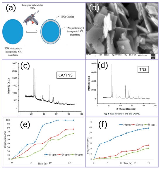 Recently, Nair developed a floating photocatalyst to accelerate the photocatalytic degradation of a TiO2 nanosheet in a cellulose acetate matrix and supplied support using ethylene vinyl acetate (Figure 9a–c) [92]. The degradation of CR dye by a floating photocatalyst made of TiO2 nanosheets performed well in both UV and solar light (Figure 9d,e).