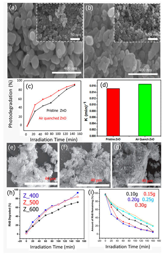 (a) Low and high magnification SEM images of ZnO, (b) air quenched ZnO, (c) photodegradation vs. irradiation time of MO dye for pristine ZnO and air quenched ZnO, (d) rate constant for after 150 min of UV exposure (Adopted with permission from Ref. [108] Copyright 2017, Elsevier), SEM images of ZnO calcined at (e) 400 °C, (f) 500 °C, and (g) 600 °C. (h) RhB degradation vs. irradiation time and (i) the effect of the catalyst load on RhB degradation (Adopted with permission from Ref. [109] Copyright 2019, Elsevier).