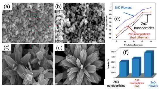 ZnO NPs also showed important catalytic activity under solar illumination. For example, ZnO NPs of various morphologies were developed by Saikia et al. [110] for the photodegradation of malachite green (MG) (Figure 11a–d). Under solar light, the flower-shaped homocentric bundles of hydrothermally synthesized ZnO nanorods (ZnO NRs) in the form of pencil-like structures demonstrate outstanding photocatalytic activity, as evidenced by the pseudo first-order kinetics of the Langmuir–Hinshelwood model in the photodegradation of MG dye (Figure 11e,f). Additionally, ZnO NPs and homocentric pencil-like ZNRs bundles in the shape of flowers were prepared.
