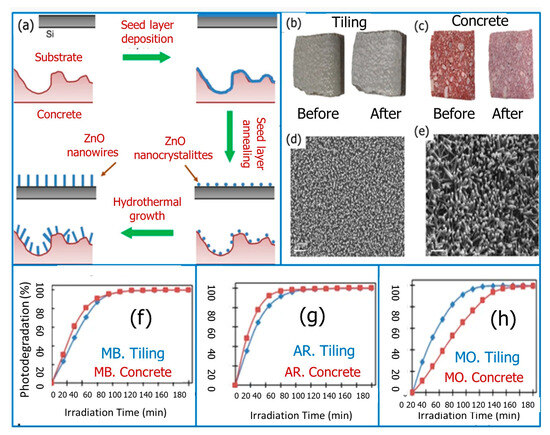 (a) Scheme of the ZnO NWs growth on a flat substrate (i.e., Si wafer) vs. a construction material (i.e., concrete), (b) top views of the gray tiling, and (c) red concrete pavement before and after the growth of ZnO nanostructures. (d) SEM top-view of ZnO NWs on the tiling surface, (e) ZnO NRs on the concrete surface, and (f–h) the photodegradation rate of MB, AR, and MO dyes vs. time. Adopted with permission from Ref. [112] Copyright 2019, Springer Nature.