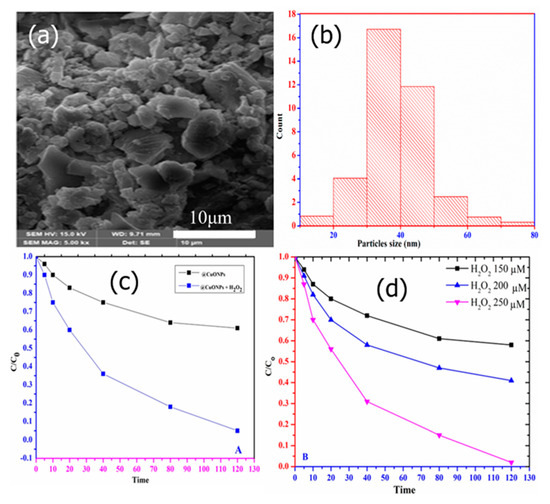 CuO nanostructures are among the interesting photocatalytic materials usually utilized for the removal of various organic pollutants due to their high abundance, low cost, narrower bandgap, excellent chemical stability, and facile synthesis [124]. The narrow bandgap of CuO makes it active in the visible region of the electromagnetic spectrum. To enhance the catalytic activity of CuO, H2O2 is often added to the reaction mixture. H2O2 is a better electron acceptor than O2, so it quickly captures the photogenerated electrons from the photocatalyst’s surface, becoming reduced and forming hydroxyl radicals (•OH) [125]. This is important for offering more active radicals, as well as reducing the rate of electron–hole recombination, which boosts the utilization of holes during the photocatalytic process. Without H2O2, CuO displays an inability to generate a sufficient amount of •OH radicals, and thus CuO is considered as an ineffective photocatalyst for degrading organic pollutants [126]. This is because the redox potential required to produce •OH radicals is higher than the VBs of CuO. Thus, CuO has weaker oxidative capabilities for the breakdown of organic contaminants and cannot produce hydroxyl radicals when illuminated. There are many works that indicate that without H2O2, CuO in different morphologies displays no catalytic activity, as reported by He et al. [127]. Recently Latief et al. prepared CuO NPs with a range of sizes between 25 and 90 nm (Figure 13a,b) to depredate CR dye from aqueous solutions. The analysis showed that the addition of H2O2 to CuO NPs significantly enhanced the degradation of CR dye under UV light, as presented in Figure 13c. In addition, increases in H2O2 result in improvements in the degradation rate (Figure 13d).