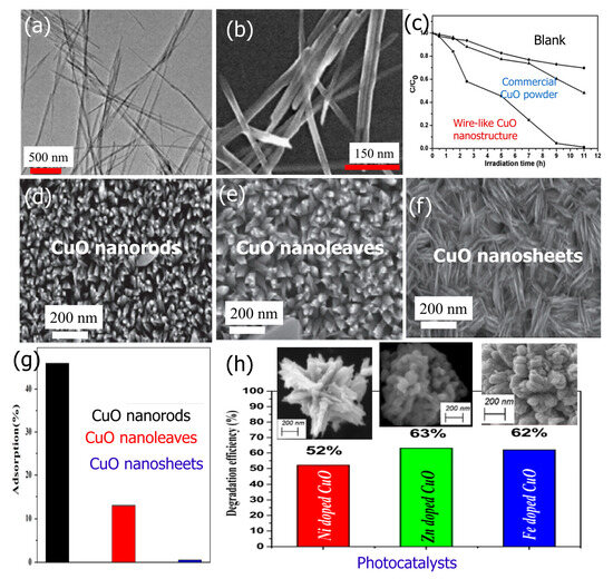 - Wang, L.; Zhou, Q.; Zhang, G.; Liang, Y.; Wang, B.; Zhang, W.; Lei, B.; Wang, W. A facile room temperature solution-phase route to synthesize CuO nanowires with enhanced photocatalytic performance. Mater. Lett. 2012, 74, 217–219. [Google Scholar] [CrossRef]