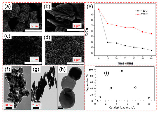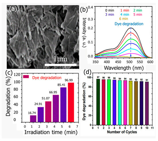The obtained data showed an enhancement in photocatalytic activity for degrading organic dyes in aqueous media with high photocatalytic stability (Figure 12f–h).